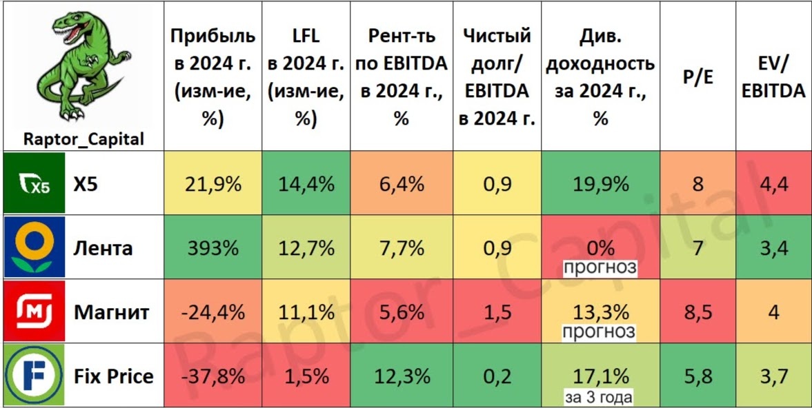 ΠΎΠ΄ΠΎΠ² Π½Π° ΠΏΠ΅ΡΡΠΎΠ½Π°Π» Π½Π°ΡΠ°Π» ΠΎΠΊΠ°Π·ΡΠ²Π°ΡΡ ΠΏΡΡΠΌΠΎΠ΅ Π²Π»ΠΈΡΠ½ΠΈΠ΅ Π½Π° ΡΠ½ΠΈΠΆΠ΅Π½ΠΈΠ΅ ΡΠ΅Π½ΡΠ°Π±Π΅Π»ΡΠ½ΠΎΡΡΠΈ ΠΏΠΎ EBITDA. β’ Π‘Π΅Π³ΠΎΠ΄Π½Ρ ΡΠ΅ΡΠΈΠ» ΡΠ°Π·ΠΎΠ±ΡΠ°ΡΡ ΡΠΎΠ»ΡΠΊΠΎ ΠΏΡΠ΅Π΄ΡΡΠ°Π²ΠΈΡΠ΅Π»Π΅ΠΉ ΠΏΡΠΎΠ΄ΡΠΊΡΠΎΠ²ΠΎΠ³ΠΎ ΡΠΈΡΠ΅ΠΉΠ»Π° (X5, ΠΠ΅Π½ΡΠ°, ΠΠ°Π³Π½ΠΈΡ, Fix Price), ΠΠΊΠ΅ΠΉ Π½Π΅ ΠΏΠΎΠΏΠ°Π» Π² ΠΎΠ±Π·ΠΎΡ ΠΈΠ·-Π·Π° ΠΎΡΠ΅Π½Ρ Π½ΠΈΠ·ΠΊΠΎΠΉ ΠΊΠ°ΠΏΠΈΡΠ°Π»ΠΈΠ·Π°ΡΠΈΠΈ. β’ ΠΠΎΠ»ΡΡΠ΅ Π²ΡΠ΅Π³ΠΎ ΠΎΡΠ»ΠΈΡΠΈΠ»Π°ΡΡ ΠΠ΅Π½ΡΠ°, ΠΊΠΎΡΠΎΡΠ°Ρ ΠΏΠΎΡΠ»Π΅ ΡΠ±ΡΡΠΎΡΠ½ΠΎΠ³ΠΎ 2023 Π³ΠΎΠ΄Π° ΠΏΠΎΠΊΠ°Π·Π°Π»Π° Π² 2024 Π³ΠΎΠ΄Ρ ΡΠΈΡΡΡΡ ΠΏΡΠΈΠ±ΡΠ»Ρ Π² 24,5 ΠΌΠ»ΡΠ΄ ΡΡΠ±Π»Π΅ΠΉ. ΠΡΠ»ΠΈ ΡΠΊΠΎΡΡΠ΅ΠΊΡΠΈΡΠΎΠ²Π°ΡΡ ΠΏΡΠΈΠ±ΡΠ»Ρ Π½Π° ΡΠ°Π·ΠΎΠ²ΡΠ΅ ΡΠ°ΠΊΡΠΎΡΡ, ΠΏΠΎΠ»ΡΡΠΈΠΌ ΡΠΎΡΡ ΡΠΊΠΎΡΡ. ΡΠΈΡΡΠΎΠΉ ΠΏΡΠΈΠ±ΡΠ»ΠΈ ΠΏΠΎΡΡΠΈ Π² 5 ΡΠ°Π·. β’ X5 ΠΏΡΠΎΠ΄ΠΎΠ»ΠΆΠ°Π΅Ρ ΠΊΠ°ΠΆΠ΄ΡΠΉ Π³ΠΎΠ΄ ΡΡΠ°Π±ΠΈΠ»ΡΠ½ΠΎ Π½Π°ΡΠ°ΡΠΈΠ²Π°ΡΡ ΠΏΡΠΈΠ±ΡΠ»Ρ (+21,9% Π² 2024 Π³.), Π² ΡΠΎ Π²ΡΠ΅ΠΌΡ ΠΊΠ°ΠΊ ΠΠ°Π³Π½ΠΈΡ ΠΈ Fix Price ΠΏΠΎΠΊΠ°Π·Π°Π»ΠΈ ΡΠ½ΠΈΠΆΠ΅Π½ΠΈΠ΅ ΠΏΡΠΈΠ±ΡΠ»ΠΈ Π½Π° 24,4% ΠΈ 37,8% ΡΠΎΠΎ