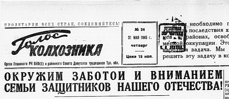 Мы приводим фрагменты публикации из газеты Тульской области "Голос Колхозника" от 31 мая 1945 года: