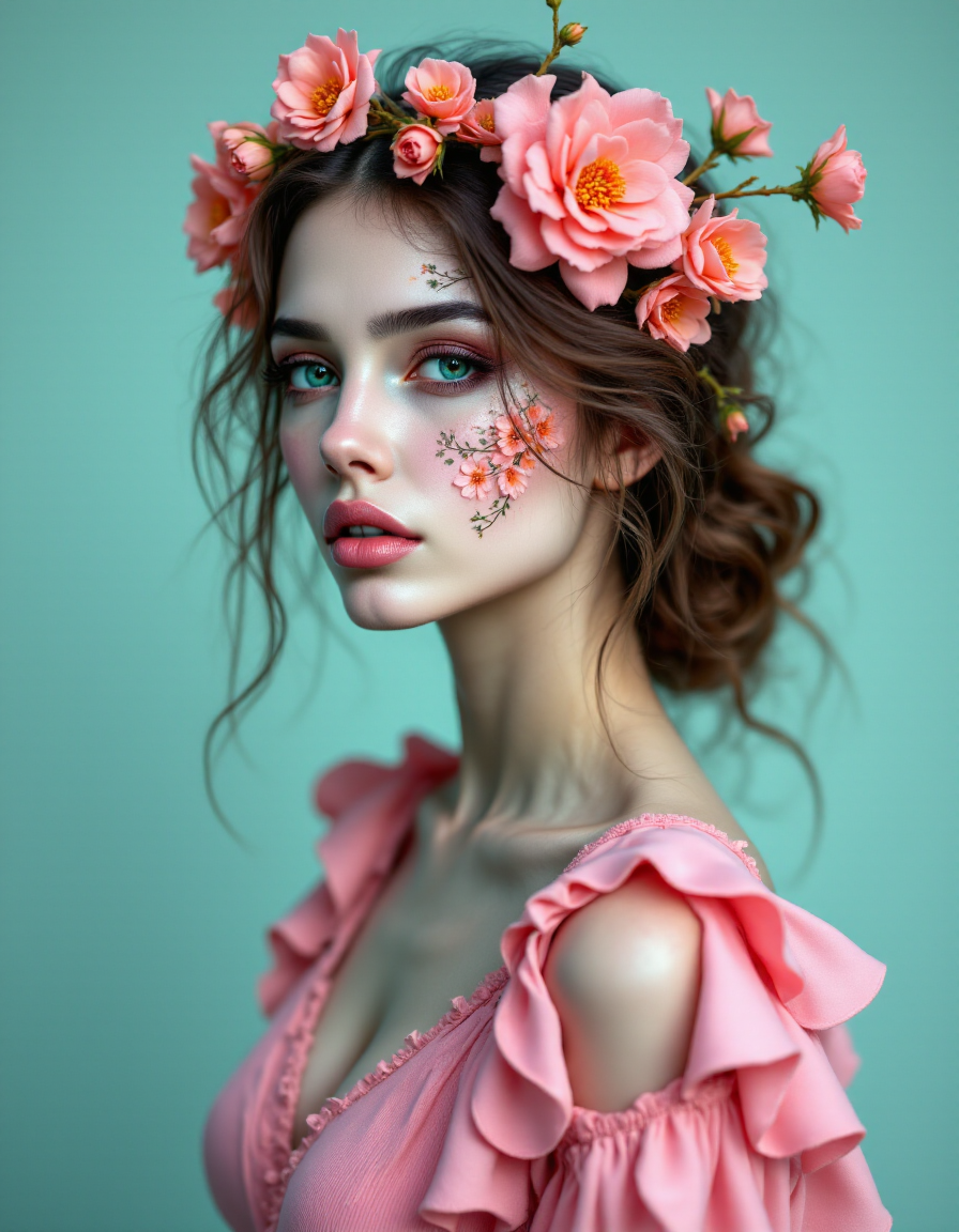 portrait of a young sexy woman with a flower crown on her head. She has a pale complexion and her face is painted with a variety of colors and patterns. Her hair is styled in loose curls and she is wearing a pink dress with ruffles on the shoulders. The background is a soft turquoise color. The woman's face is covered in intricate designs and patterns, including flowers, leaves, and other floral motifs. She is looking off to the side with a serious expression on her face. The overall mood of the image is dreamy and etherea