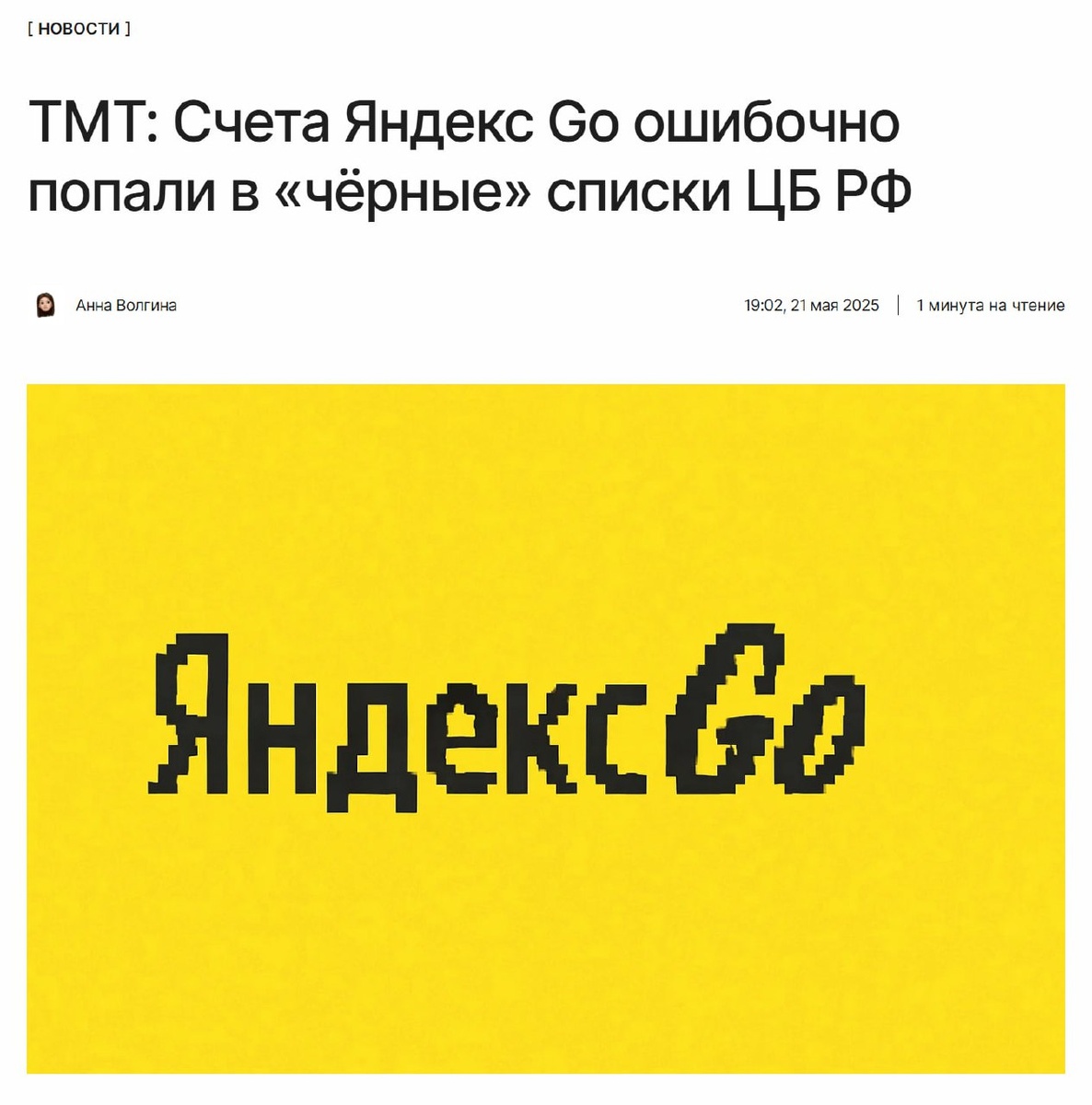 Счёт Яндекс Go ошибочно попал в «чёрный» список ЦБ РФ. Из-за сбоя юрлица целые сутки не могли оплачивать услуги «Яндекс.Такси».