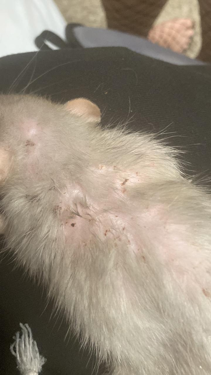 В какой-то момент крысочка начинает много чесаться, нервно груммить себя, возникают бородавкообразные наросты на ушах, появляются расчесы в области шеи, за ушами, облысение некоторых зудящих областей. Симптомы могут быть не все разом, ведь паразиты имеют разновидности. Но все же есть общая черта — зуд.