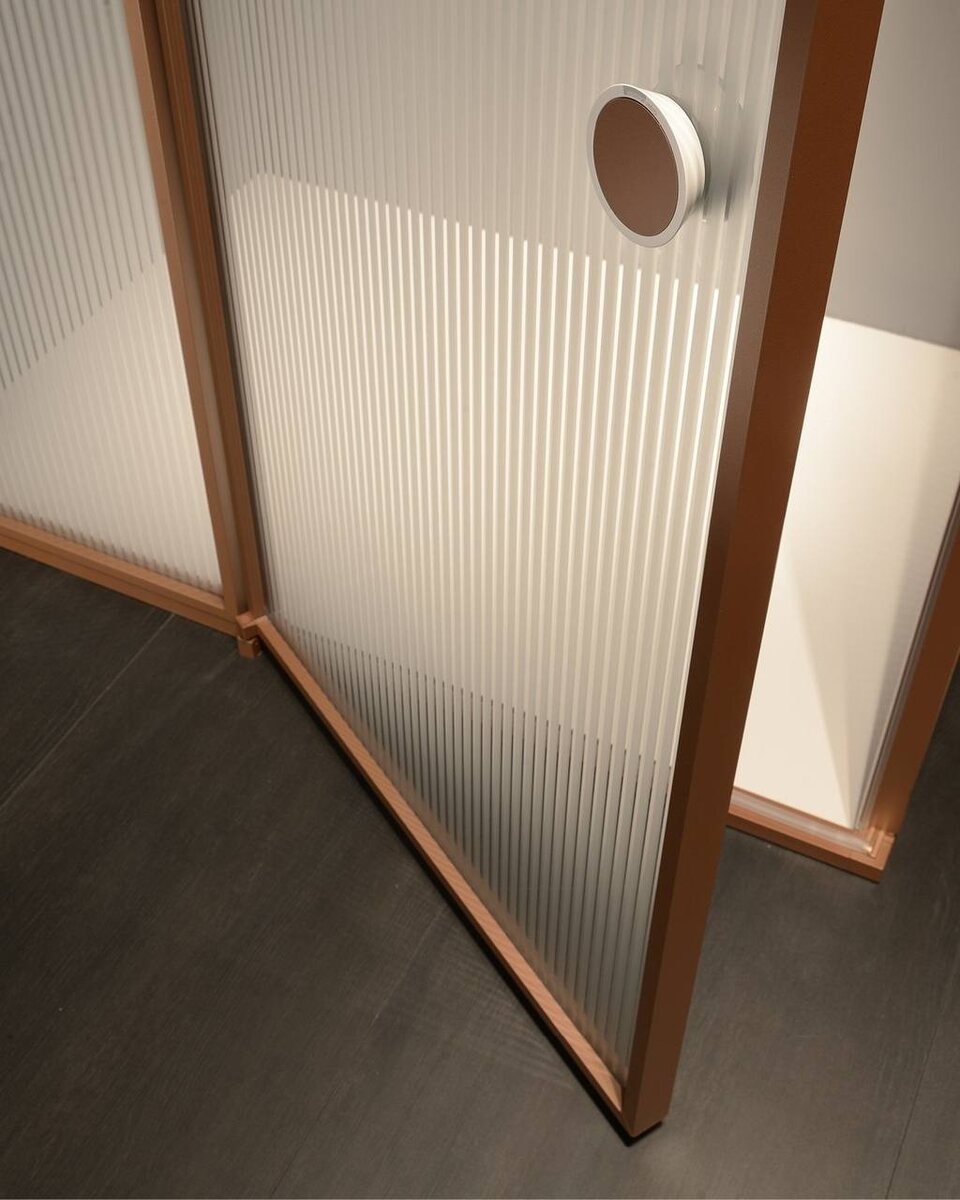 VismaraVetro. В Suite прозрачность стекла сочетается с элегантностью алюминия, создавая игру света. Модульная система Suite состоит из фиксированных панелей и дверей из алюминия и стекла максимальной высотой 300 см. Петли, открывающиеся на 180°, позволяют двери опираться на фиксированную панель. На фото: стекло 39 Stripes, профиль Bond Copper 84, дополнительная круглая ручка. Хотите заказать или узнать подробнее? ▫️Звоните нам📲 +7(495)120-67-77 #vismaravetro #сантехника #bathroom #designbathroom