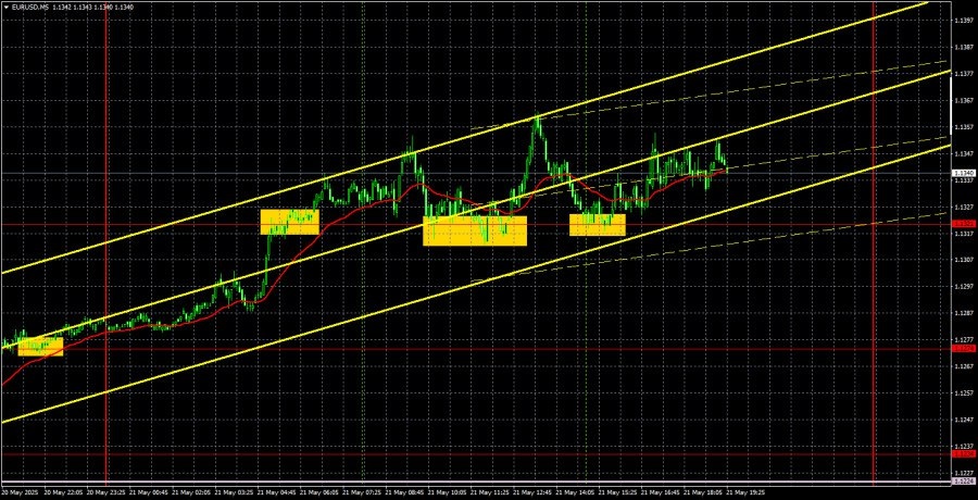 https://basechop.ru/wordpress/?p=43589 Анализ EUR/USD 5M. Валютная пара EUR/USD в течение среды возобновила восходящее движение, и теперь можно сказать, что восходящий тренд имеет место быть не только на часовом ТФ, но и на более старших ТФ. Если быть точнее, то на 4-часовом и дневном ТФ мы имеем дело с возобновлением старого тренда имени Дональда Трампа. В понедельник мы говорили, что рынок использовал весьма формальные причины для возобновления продаж американской валюты. Во вторник причин продавать доллар вообще не было никаких. В среду – тоже. Тем не менее, только на этой неделе американская валюта потеряла около 170 пунктов. Без новостей, без причин. Если даже рынок и обрадовался деэскалации торговой войны, то ненадолго. И сам факт деэскалации «по Трампу», которая означает лишь снижение тарифов в обмен на переговоры, тоже уже не слишком радует трейдеров. Проблема заключается в понимании участниками рынка того, что действия Трампа и его команды лишь с низкой долей вероятности…