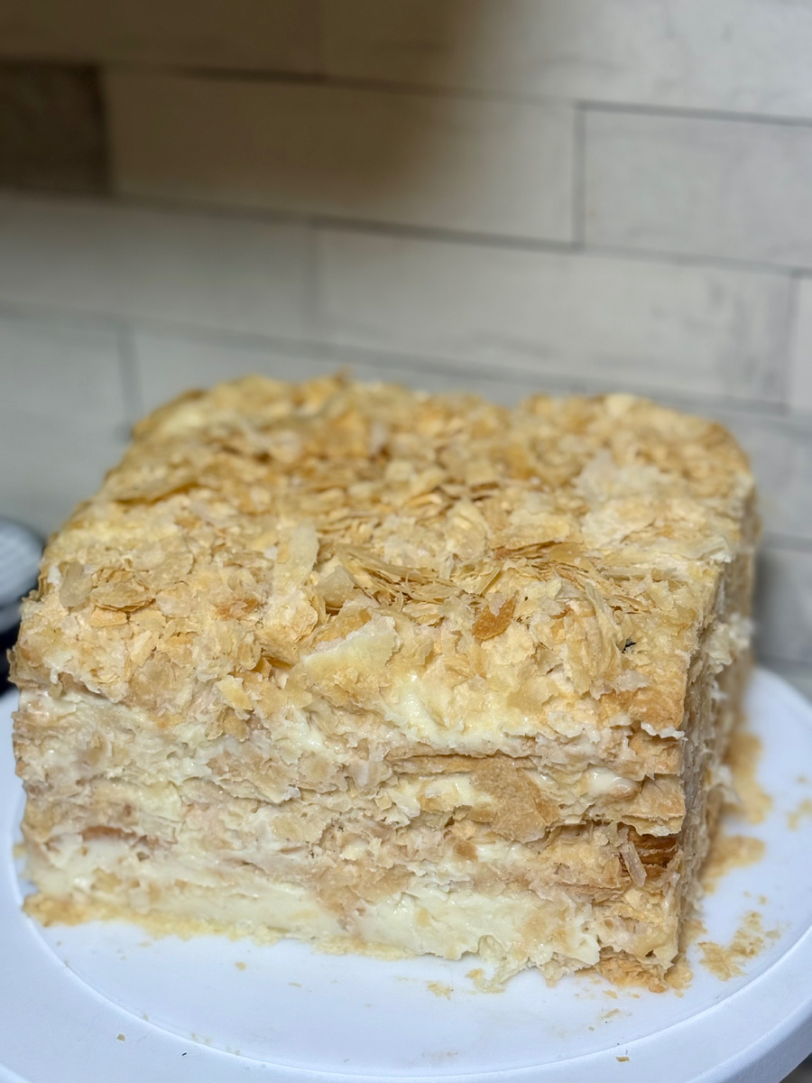 Я не фанат торта Наполеон, но иногда делаю его для мужа. Недавно как раз был такой случай, захотелось ему Наполеон, а мне так лень было возится с коржами. Решила сделать из готового слоеного теста. Быстро, просто, без заморочек и при этом вкусно 🎂 Вес торта получается около 2 килограмм, но рецепт можно смело делить на две части. Нам понадобится Тесто слоеное без дрожжевое - 1кг У меня 2 упаковки по 2 пластины, вес одной пластины 250 грамм. Размораживаем и выпекаем при 200 градусах 15-20 мин. Разделяем каждую пластину на 3 коржа. Золотистые верхушки снимаем и складываем в контейнер, будет обсыпка для торта Заварной крем Молоко (я беру молоко и сливки 10% 50 на 50) - 1 литр Яйца - 4 штуки Сахар - 300 грамм Мука - 4 ст.ложки Сливочное масло 82,5 - 150 грамм Ванильная паста - 2 ч.л (можно использовать обычный ванилин) В кастрюльке с толстым дном объединить яйца, сахар и муку. Смешать венчиком, добавить 250 мл молока, снова смешать до однородности. Влить остальное молоко постоянно поме