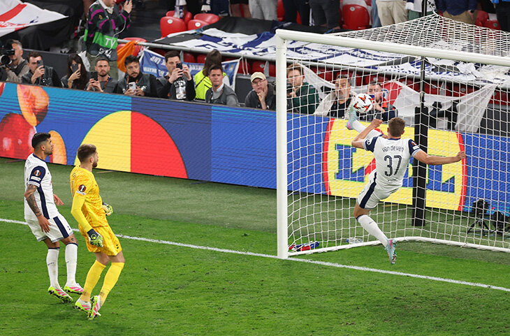 После ошибки вратаря. В середине второго тайма при 1:0 кипер «Тоттенхэма» Гульельмо Викарио не смог забрать мяч на выходе, «Манчестер Юнайтед» закидывал в пустые ворота – но там возник Микки ван де Вен. И как возник! Этот сэйв в прыжке – теперь символ победы «Тоттенхэма» в Лиге Европы. Прямо с ленточки! В рамку. Просто невероятно. Сэйв года! Игроки «МЮ» на фоне – разочарование. Ван де Вен – героическая радость. Викарио – облегчение. Потом, в самом конце, он еще вытащит опасный удар Люка Шоу на ленточке, внесет и свое. Но главный сэйв – это Ван де Вен. «Тоттенхэм» выиграл ЛЕ! 1-й трофей за 17 лет благодаря нелепому голу «МЮ» 😳 В ЛЧ – с 17-го места! Антирекорд вместе с трофеем у «Тоттенхэма» Фото: Gettyimages.ru/Michael Steele, Carl Recine, Ryan Pierse
