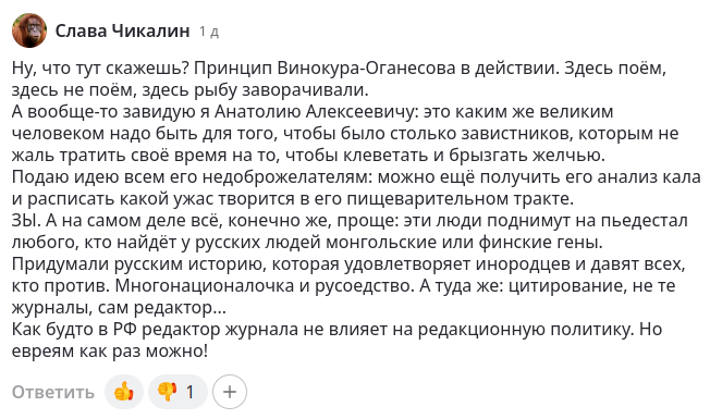 Комментарий выше, если что, был оставлен под нашей статьёй, посвящённой генетическому фрику Анатолию Клёсову.