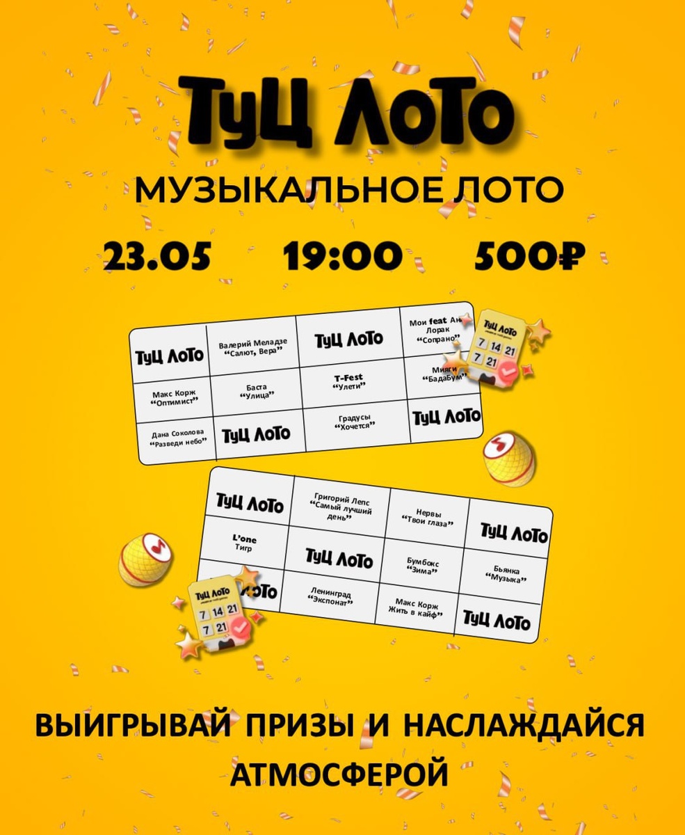 Петь, выигрывать и танцевать до упаду Хочешь? Тогда приходи на музыкальное ТуцЛото. Получи бланк со списком песен, зачеркивай номера, которые вытягивает ведущий из мешка. Подпевай, танцуй. И как только соберется определенная комбинация – забирай выигрыш. Главный приз – депозит в Harat's на 7000 рублей 🕐23 мая, 19.00 📍Harat’s Republic 🪙 500 рублей 🔑забронировать участие можно здесь #Афиша Предложить публикацию @zabkulisye_bot