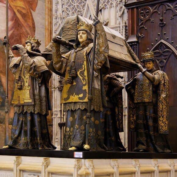 Собор Севильи. И Колумб — сразу за дверью. Его саркофаг не стоит. Он вздымается над землёй, покоясь на плечах четырёх аллегорий — Кастилии, Арагона, Наварры и Леона. Четыре королевства, из которых сложилась Испания времён великих открытий. Эта гробница появилась в соборе только в 1899 году. Скульптор Артуро Мелида задумал её как величественное прощание с эпохой Колумба. Изначально саркофаг стоял в Гаване. Но когда Испания утратила Кубу, останки мореплавателя вернулись домой — в Севилью. А история его посмертных странствий могла бы стать отдельным романом. Умер — в Вальядолиде (1506). Похоронен — в Севилье. В 1542 — перевезён в Санто-Доминго. Позже — в Гавану. И, наконец — снова в Севилью. Как будто даже после смерти Колумб продолжал двигаться сквозь карту мира, которую сам же помог нарисовать.