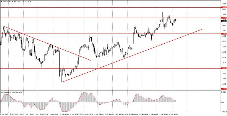 https://basechop.ru/wordpress/?p=43611 Разбор сделок среды: 1Н график пары GBP/USD. Пара GBP/USD в течение среды также продолжала восходящую тенденцию, которая сформировалась в последние две недели. Напомним, что последнее укрепление доллара США произошло на новости о снижении взаимных пошлин между США и Китаем на 115%. Тогда многие посчитали, что торговая война дальше будет только деэскалировать и, возможно, это действительно так. Вот только доллар США даже с этой новости не может получить никаких дивидендов. Начиная с понедельника текущей недели, ни одной «ужасной» новости для доллара не поступало. Снижение кредитного рейтинга США – это, конечно, плохо, но это не настолько печальное событие, чтобы американская валюта падала каждый день. Макроэкономический фон в последние дни вообще отсутствовал, если не считать отчета по британской инфляции, который стал лишь еще одним гвоздем в крышку гроба американской валюты. Таким образом, мы видим то, что видят все – доллар распродается по люб
