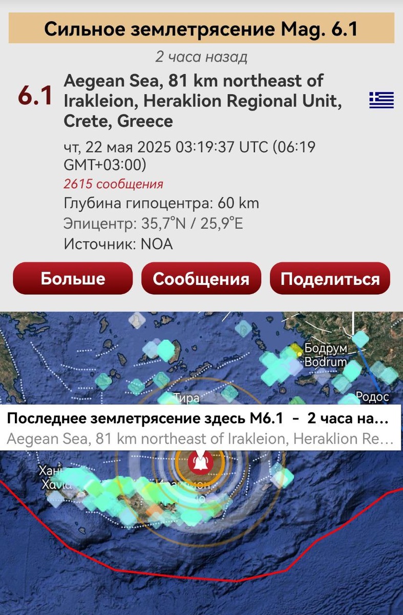 Согласно прогнозу от 16 мая произошло землетрясение М6.1 возле Крита.
