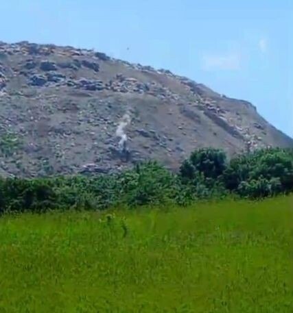 Из огромной горы отходов снова видна небольшая струя дыма.