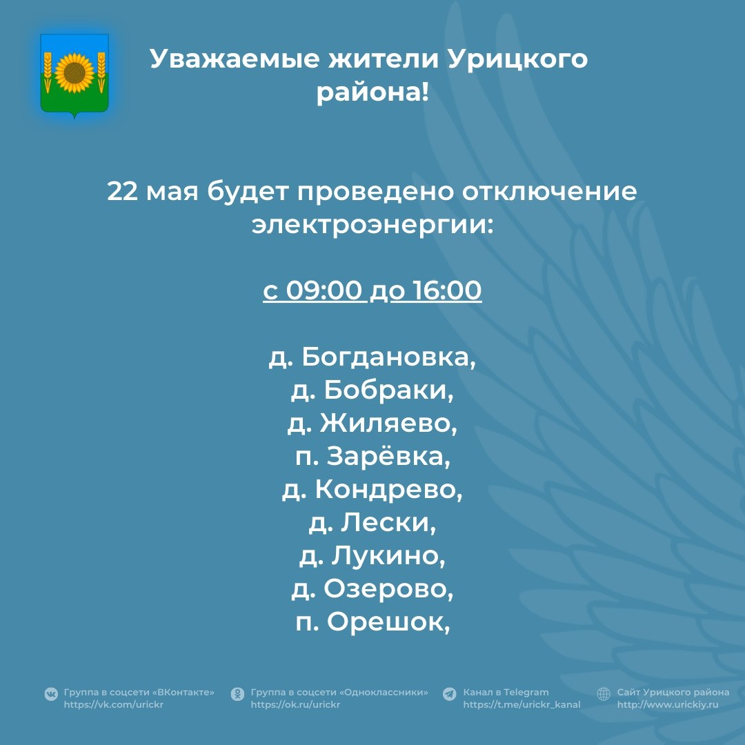 Уважаемые жители Урицкого района! 📢 22 мая будет проведено плановое отключение электроэнергии. Все подробности в карточке ⬇ #УрицкийРайон #АдминистрацияУрицкогорайонаОрловскойобласти