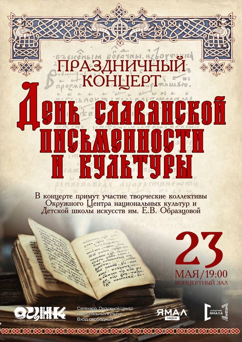 Приглашаем вас на праздничный концерт посвященный - Дню славянской письменности и культуры. Ежегодно 24 мая отмечается День славянской письменности и культуры – в этот день чтят память святых равноапостольных Кирилла и Мефодия, просветителей, создавших первую славянскую азбуку и осуществивших перевод богослужебных текстов на славянский язык, тем самым заложив фундамент славянской письменности. Именно благодаря их подвижническому труду славянские народы получили возможность читать и писать на родном языке, приобщаться к христианской вере и развивать свою самобытную культуру. Этот праздник символизирует национально-духовное единство славянских народов, объединенных общими историческими корнями, традициями, обычаями и культурным наследием. Когда: 23 мая, 19:00. Где: Окружной Центр национальных культур (Концертный зал), г. Салехард, ул. Республики д.74 Вход свободный.