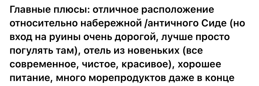 Первое, это классная локация! Здесь не только отличные песчаные пляжи, здесь вся городская инфраструктура. Отель находится в городе Сиде, в 65 км от аэропорта Антальи, поэтому можно гулять во всех направлениях, Старый город Сиде (гордость турок!) близко, приятная набережная и куча старины, ухоженной и благородной, по сторонам. Плюс магазины, лавки, рынок, банки-обменники валюты, Мигросы, Карефуры, Вайкики и прочее. До Манавгата, до большого ТЦ Нова Молл, можно добраться за 15 минут на долмуше.