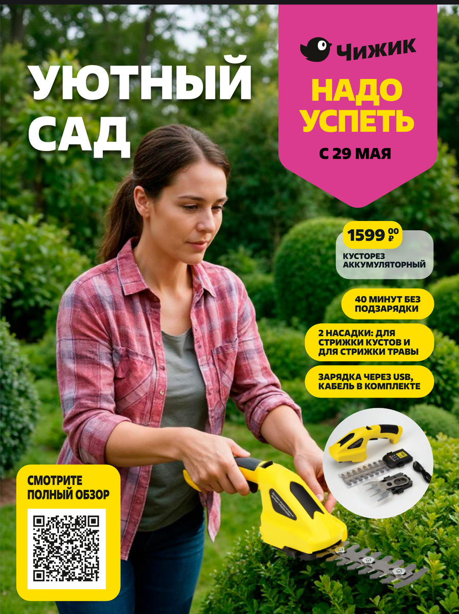 Привет-привет мои дорогие читатели! Вот решила быстренько вам рассказать про свои первые впечатления от свежего каталога Чижика. Уже со следующей недельки, с 29 мая, мы увидим кучу всего нового и классного! Обсудим всё самое интересное вместе и обменяемся мнениями прямо тут в комментах 😉 Сразу хочу напомнить: всё, что вы видите на моих ресурсах — это чистая информатика. Никакой рекламы, никаких обязательств покупать. Это просто моя попытка делиться свежими акциями, ценами и отзывами. Моё мнение субъективно, и цель одна — поддержать вас в поиске выгодных покупок! Эта статья буквально набрана на бегу, потому что меня ждёт ещё столько интересного впереди! Прошу простить, если где-то выскочат маленькие шероховатости текста — стараюсь писать оперативно, чтобы информация пришла к вам первой! 😅 Тем, кто пропустил мой предыдущий обзор о новинках в ЧИЖИКе, обязательно зайдите сюда 👇 Обложка сразу привлекла внимание — анонсировали новый аккумуляторный кусторез за 1599 рублей! Думаю,