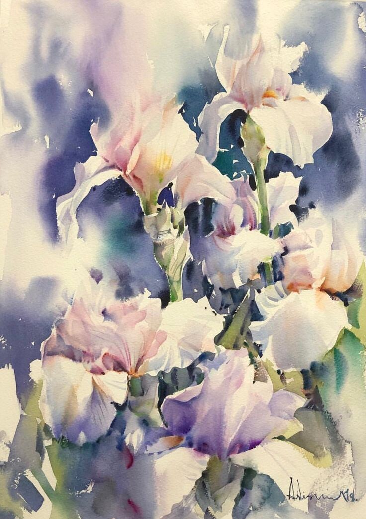Adisorn Pornsirikarn – современный художник из Таиланда. Рисовать он начал в раннем детстве и творчество стало делом всей его жизни. Adisorn Pornsirikarn получил заслуженное признание у себя на родине и не только. Работы мастера украшают практические все тайские посольства, участвуют в международных выставках и получают высокие награды. Он постоянно совершенствует свою технику, хотя кажется, что его работы и без того безупречны. Adisorn использует соль для создания «кристаллических» эффектов на фоне, сухую кисть для прорисовки текстуры и прожилок и применяет многослойную лессировку, чтобы добиться того самого перелива оттенков, какие бывают только в природе. Оттого его цветы – концентрация нежности, динамики, лёгкости и струящейся свежести. На них невозможно смотреть равнодушно 🥰 Уверена, вас вдохновили космические ирисы, и хочется тоже нарисовать их. На мини-курсе мы как раз рассматриваем все нюансы изображения этих волшебных цветов. Вы получите огромное удовольствие уже от процесса