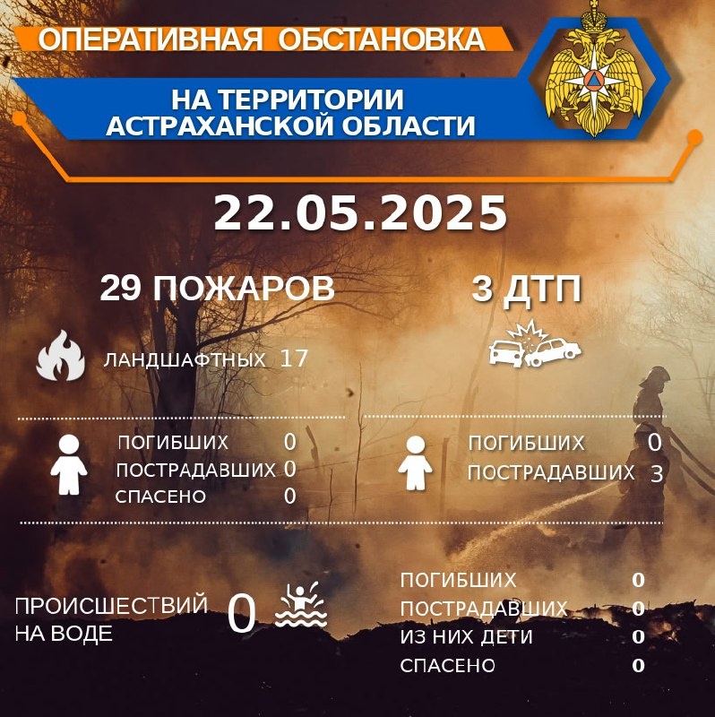 🚨Оперативная обстановка на территории Астраханской области по состоянию на 00:00 22.05.2025🚒