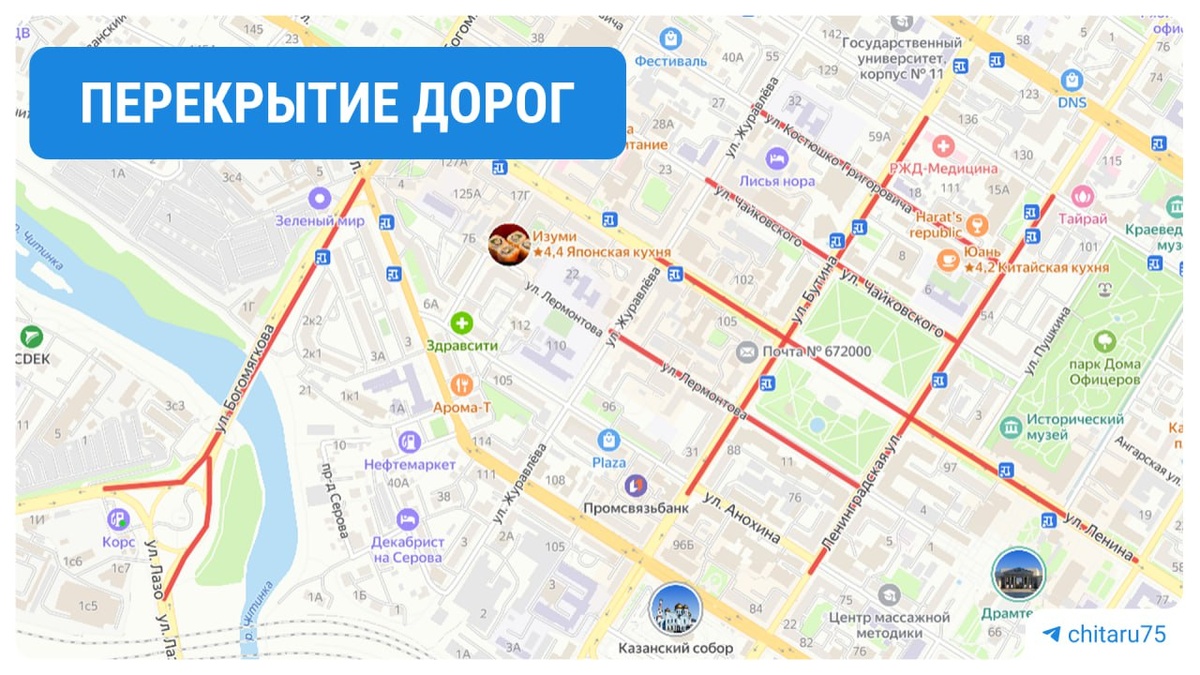 Дороги в центре Читы будут перекрывать три дня из-за празднования Дня города. 23 мая с 08:30 до 09:30 полностью перекроют улицу Богомягкова — от Кастринской до Недорезова. 24 мая с 08:00 до 23:00 на личном авто нельзя будет проехать по улицам: ⏺ Ленина — от Полины Осипенко до Журавлева; ⏺ Ленинградская и Бутина — от Чкалова до Анохина; ⏺ Костюшко-Григоровича — от Ленинградской до Журавлева; ⏺ Лермонтова — от Ленинградской до Журавлева; ⏺ Чайковского — от Пушкина до Журавлева. Для общественного транспорта эти улицы перекроют с 09:00 до 10:00 и с 12:00 до 13:00. Этот же маршрут перекроют и 25 мая — с 08:00 до 23:00 для читинцев на своих машинах, а для маршруток, троллейбусов и автобусов — с 9:00 до 11:00. 🟦 Подписаться