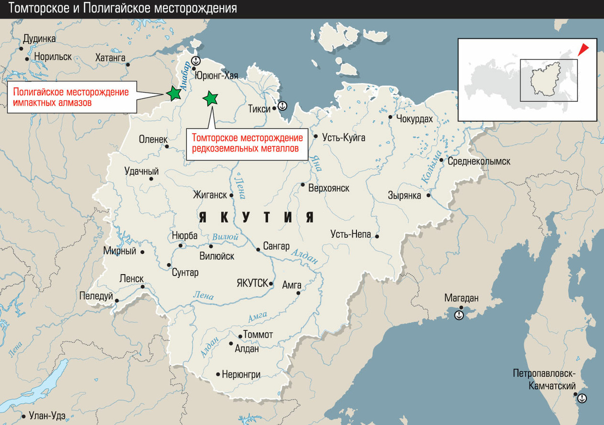 Томтор в республике Саха (Якутия) считается крупнейшим месторождением ниобия и редкоземельных металлов с наиболее высоким содержанием в мире. Прогнозные ресурсы оценивают в 154 миллиона тонн руды с высоким содержанием оксидов десяти элементов, в том числе тербия, иттрия и скандия.