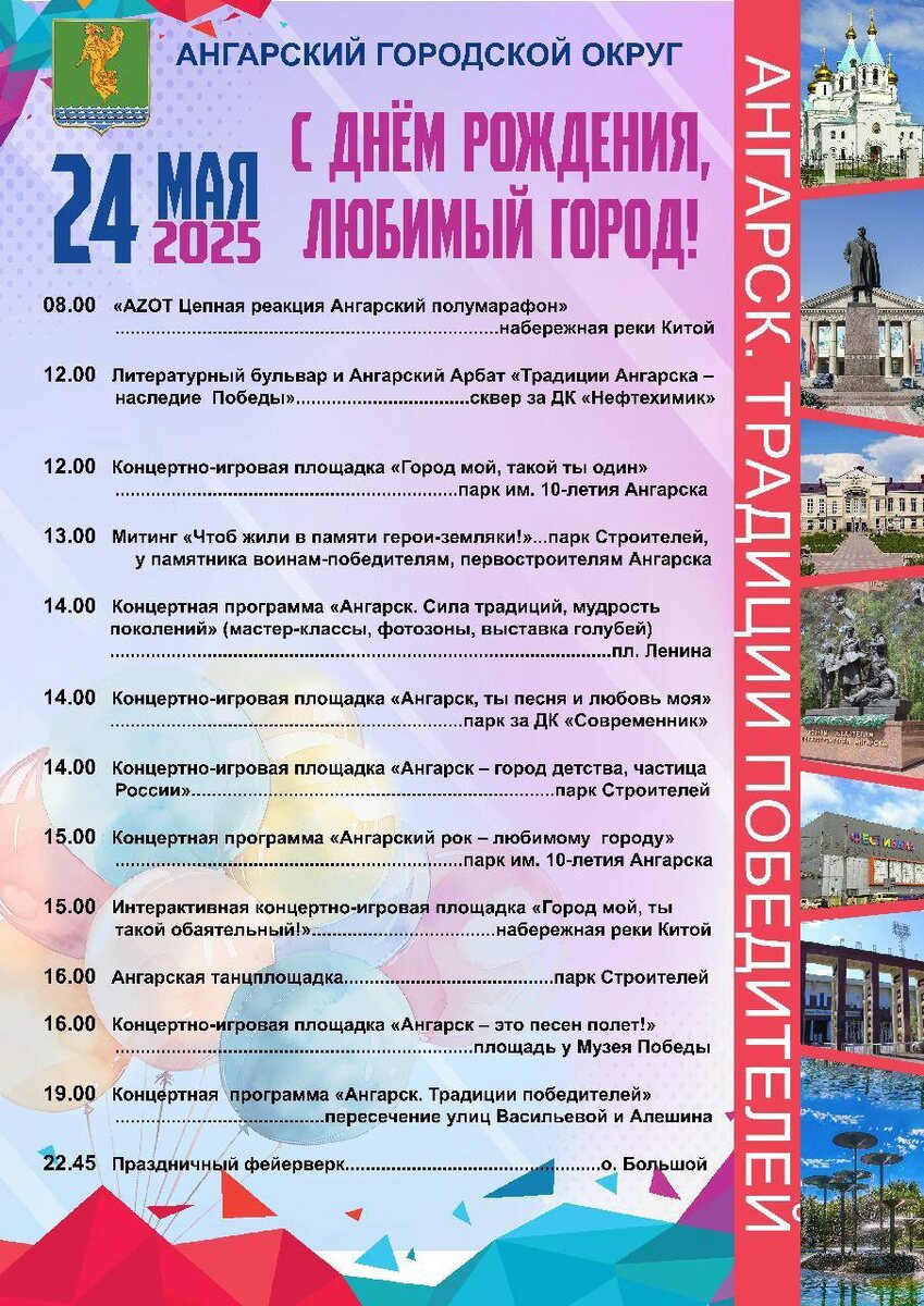 ✨➡️Афиша мероприятий ко дню рождения Ангарска 👇👇👇 🔹Схема автомобильного движения по улице Алешина временно изменится в связи с празднованием Дня города Одной из центральных точек мероприятий, посвященных дню рождения города, 24 мая, станет бульвар имени 80-летия Победы. Для обеспечения безопасности горожан в связи с подготовкой и проведением праздника движение по улице Алешина будет ограничено с 22 по 25 мая и полностью перекрыто 24 мая. 🎙Для установки мобильной сцены выезд с улицы Васильевой (бывшей Радужной) на улицу Алешина закроют уже 21 мая, в 10.00. Движение по Алешина будет осуществляться по трем полосам – временно здесь установят знак «Сужение дороги». Праздничным утром 24 мая череду мероприятий откроет традиционный Ангарский полумарафон. Его маршрут пройдет не только по набережной, но и по улицам города. Чтобы обеспечить безопасность участников соревнований, улицу Алешина в двух направлениях полностью перекроют с 07.00 до 14.00 от Васильевой до Ангарского проспекта.