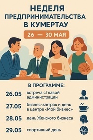 С 26 по 30 мая 2025 года в Кумертау Республики Башкортостан в соответствии с целями национального проекта «Эффективная и конкурентная экономика» состоится традиционная Неделя предпринимательства, приуроченная ко Дню российского предпринимательства. В рамках Недели пройдут мероприятия разных форматов для предпринимателей города. Неделя предпринимательства начнется 26 мая со встречи главы администрации с предпринимательским сообществом г. Кумертау, состоится подведение итогов совместной работы, награждение за успехи и вклад в развитие предпринимательства. 27 мая будет организован бизнес-завтрак, с предпринимателями встретится бизнес-шериф г. Кумертау по вопросам на тему: «Старт в креативной индустрии 2025». На бизнес-завтраке всех ждет презентация нового фирменного кофейного напитка местного бренда.