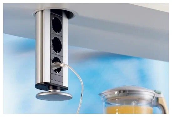 Если мы рассматриваем кухню, в которой на столешнице не стоит никаких тостеров, чайников и соковыжималок с постоянным подключением к сети, либо продумано такое подключение в скрытом варианте (тут тоже есть вопросы), то да – отказ от розеток возможен. Вам нужно включить некий кухонный агрегат на 5-10 минут, нажимаете, выезжает блок розеток, пользуетесь и отправляете обратно. Но, чисто эстетически свисающие провода будут смотреться так себе, поэтому, если уж мы говорим о скрытых розетках, то лучше рассмотреть тот же выезжающий блок, но спрятанный в нижнюю базу.