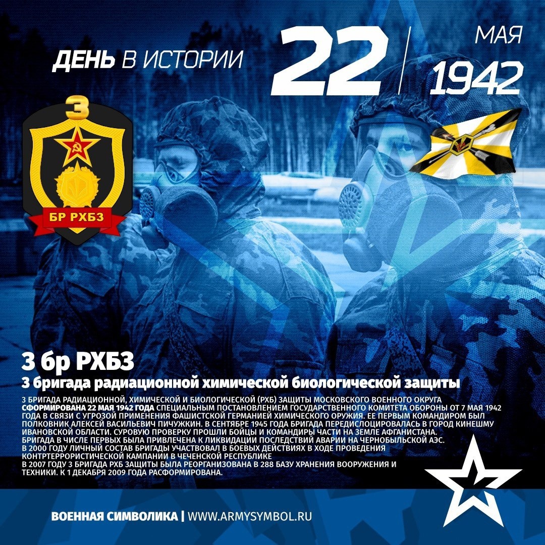 3 бр РХБЗ с 1942 3 бригада радиационной химической биологической защиты 3 бригада радиационной, химической и биологической (РХБ) защиты сформирована 22 мая 1942 года специальным постановлением Государственного комитета обороны от 7 мая 1942 года в связи с угрозой применения фашистской Германией химического оружия. Ее первым командиром был полковник Алексей Васильевич Пичужкин. Основными задачами бригады в тот период были выполнение специальных заданий на Северном Кавказе и дымовая маскировка боевых действий наших войск и важных тыловых объектов на подступах к городу Горькому (ныне – Нижний Новгород). Родина по достоинству оценила вклад офицеров и солдат в общее дело достижения победы над врагом: за годы войны 105 человек были награждены орденами и 1553 – медалями. В сентябре 1945 бригада передислоцировалась в город Кинешму Ивановской области. Личный состав принимал участие во многи Показать полностью... Подпишитесь на наши группы ВКонтакте и в Одноклассниках - читайте, смотрите и ко