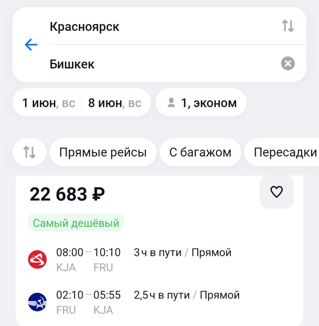 Наступает наша "любимая" пора: билеты минимум за 20к https://aviasales.tp.st/dcHv88zw Бишкек на начала июня следующий 👆 Кстати совсем скоро иата-код Бишкека #FRU сменится на #BSZ. @KJA
