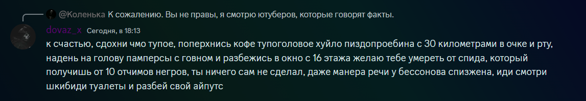 Всем даров и сегодня я буду разбирать кто же такой же Азер,и под какой личностью он скрывается, ставьте не ставьте поставьте не поставьте лайк а мы начинаем. Все вы когда- то замечали таких людей как "Полковник Троцкий, Dovaz, Dovazzoro, Азерчай не" все эти люди под одним человеком Азером. Азер это 13 летний мальчик Никита,который посылает всех,и оскорбляет . У Азера скорее развивается шизофрения и аутизм, видимо в школе с ним никто не дружит,потому что Никита плохо выражается. Раньше Азерчай был пони, потом он вышел из этой организации , возможно его не любили и-за этого он всех покрывает матом,что некоторые смеются. Еще у него есть такие коронные фразочки как: Огооооо Чё Если Азер не понимает написанного он пытается перевести эту тему . Ещё Азер хочет набрать себе аудиторию чтобы его любили . Например: у нас был с ним скандал в чате ПЖАИ,и когда Крип влез я его послал ( чтобы не мешал) и кароче чё то было дальше но вот как он захотел набрать аудиторию:"Защитить человека" может та