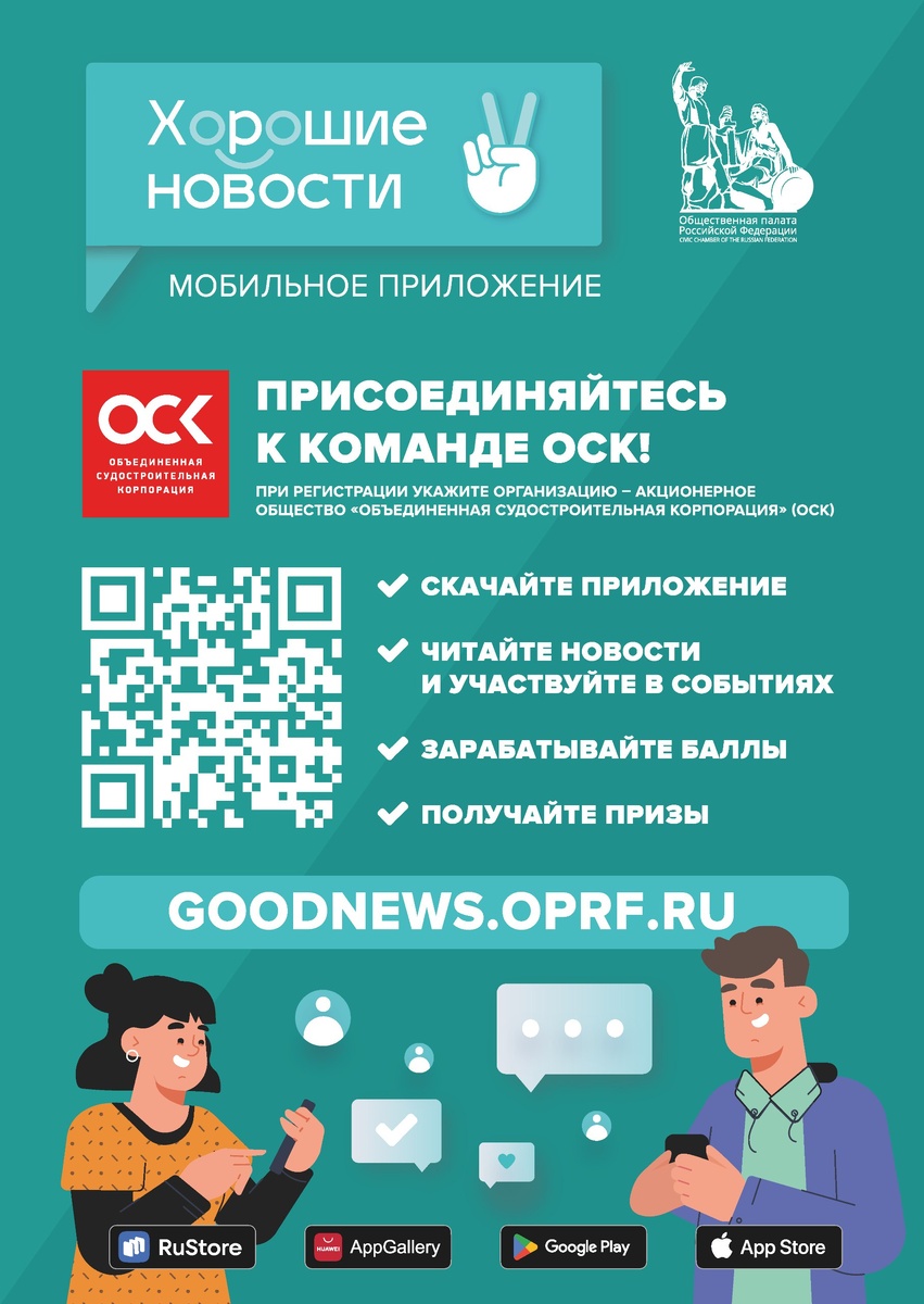 Присоединяйтесь к проекту «Хорошие новости» Проект «Хорошие новости» — это мобильное приложение с позитивным контентом о жизни в России, достижениях страны в разных сферах: промышленности, технологиях, спорте, культуре, образовании. В приложении размещается только верифицированный контент, собранный из разных проверенных источников, в том числе и актуальные производственные новости обществ Группы ОСК. Пользователь получает персонифицированную по интересам информацию и может делиться ей в социальных сетях (ВКонтакте, Одноклассники). В качестве дополнительной поддержки для активных участников приложения есть возможность заработать баллы и обменять их на призы. ОСК │НевскийССЗ