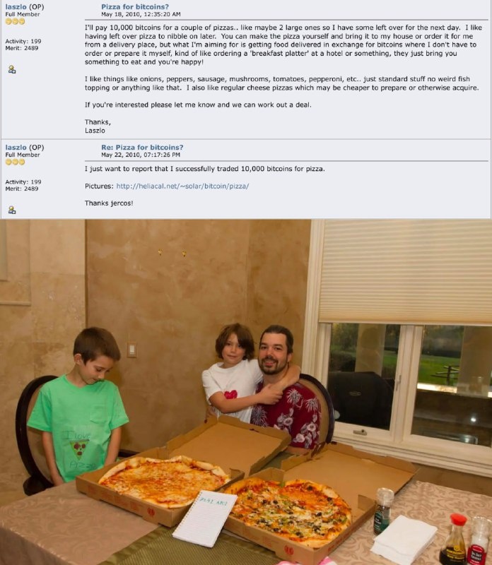 Представьте себе: 15 лет назад, 22 мая 2010 года, когда биткоин был еще юным и никому не известным цифровым чудом (ну, почти никому – гики и провидцы не в счет!), один смелый программист из солнечной Флориды по имени Ласло Ханеч решил, что хватит этим виртуальным монеткам пылиться на жестком диске. Пора бы им послужить чему-то более приземленному и… вкусному!