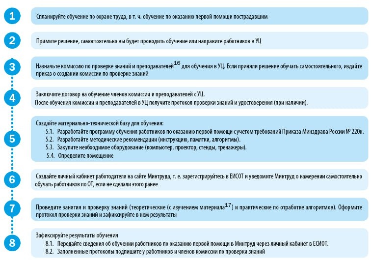 В статье приводим подробный пошаговый алгоритм обучению оказанию первой помощи и примеры документов, которые при этом должны быть оформлены.