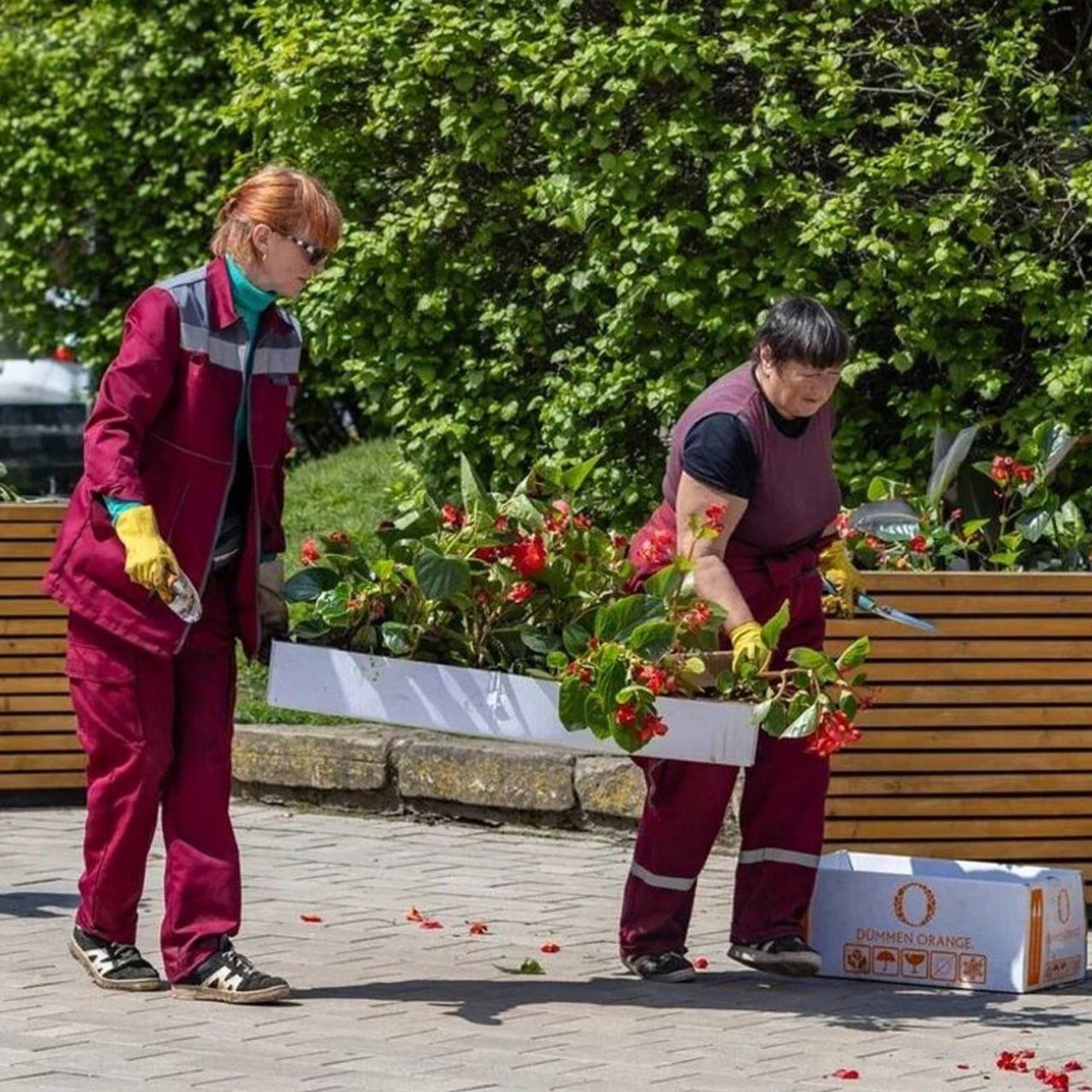 Специалисты по озеленению обновляют цветочные зоны и высаживают деревья.