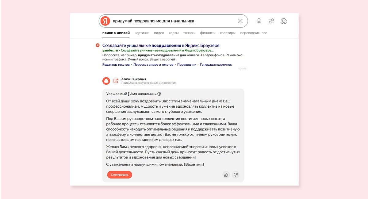 «Яндекс» обновил поисковик. На смену сервису «Нейро» пришёл «Поиск с Алисой». Теперь «умные» ответы в выдаче будут нагляднее за счёт структуры и медиаконтента, а ещё подробнее благодаря режиму «рассуждений». Добавили также возможность генерировать тексты и картинки, задавая запрос нейросети через поисковую строку vc.ru/ai/2001893