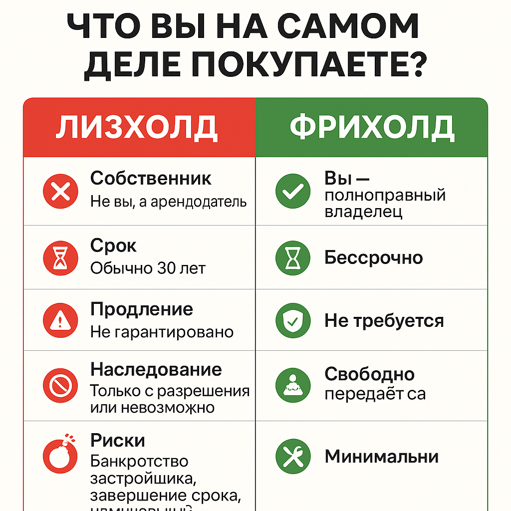 Мы, как юридически подкованная компания, не продаём leasehold, потому что не имеем морального права предлагать клиенту риск вместо собственности. Наш приоритет — ваша безопасность, контроль над капиталом и защита прав.