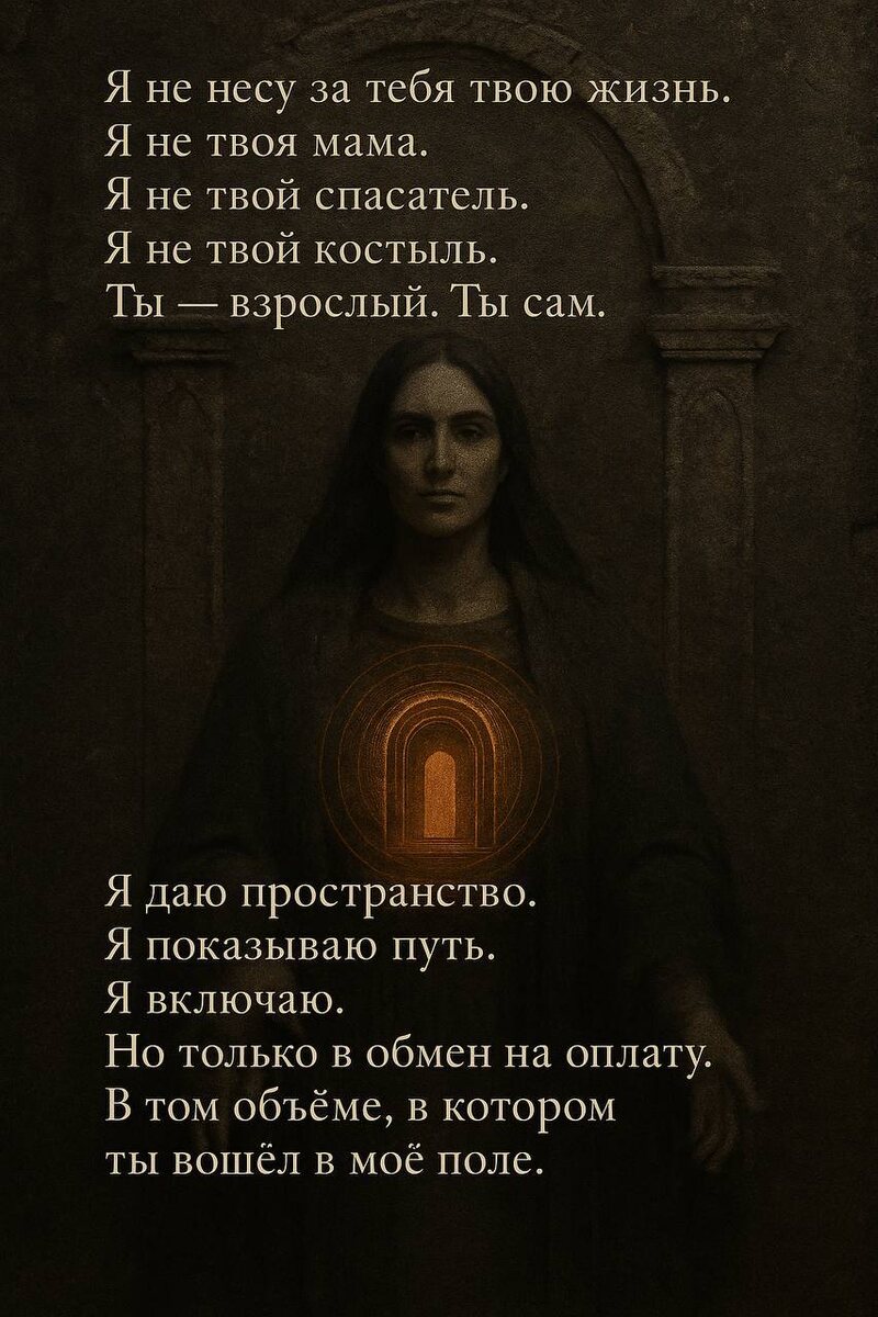 Некоторые скажут, что это слишком жёстко. Что я осуждаю. Что я некрасиво себя веду. Что это — «неуважение к клиентам*». Я знаю. Мне это уже говорили. — «Ты слишком жёсткая» — потому что правда обнажает. — «Ты осуждаешь» — потому что я не подтверждаю иллюзию, что всё в порядке. — «Ты некрасиво себя ведёшь» — потому что я не обслуживаю чужое удобство. А самое главное — это не клиенты*. Это наблюдатели, энергетические иждивенцы, которые хотят сохранить доступ к кормушке — без вложений, без взросления. Те, кто не платит, но хочет доступ. Кто не входит, но хочет моего внимания. Кто не выбирает себя, но хочет, чтобы я выбирала их. Они не против меня. Они за себя — но по-детски: «Ты должна быть хорошей, чтобы я осталась рядом и ничего не делала». С этим покончено. То что я сейчас делаю — это не резкость. Это зрелость. Я поставила границу. А те, кого она задела — те, кому было удобно, когда границы не было. И если кто-то после этого уйдёт — он и не собирался входить. Он просто пользовался. Вес