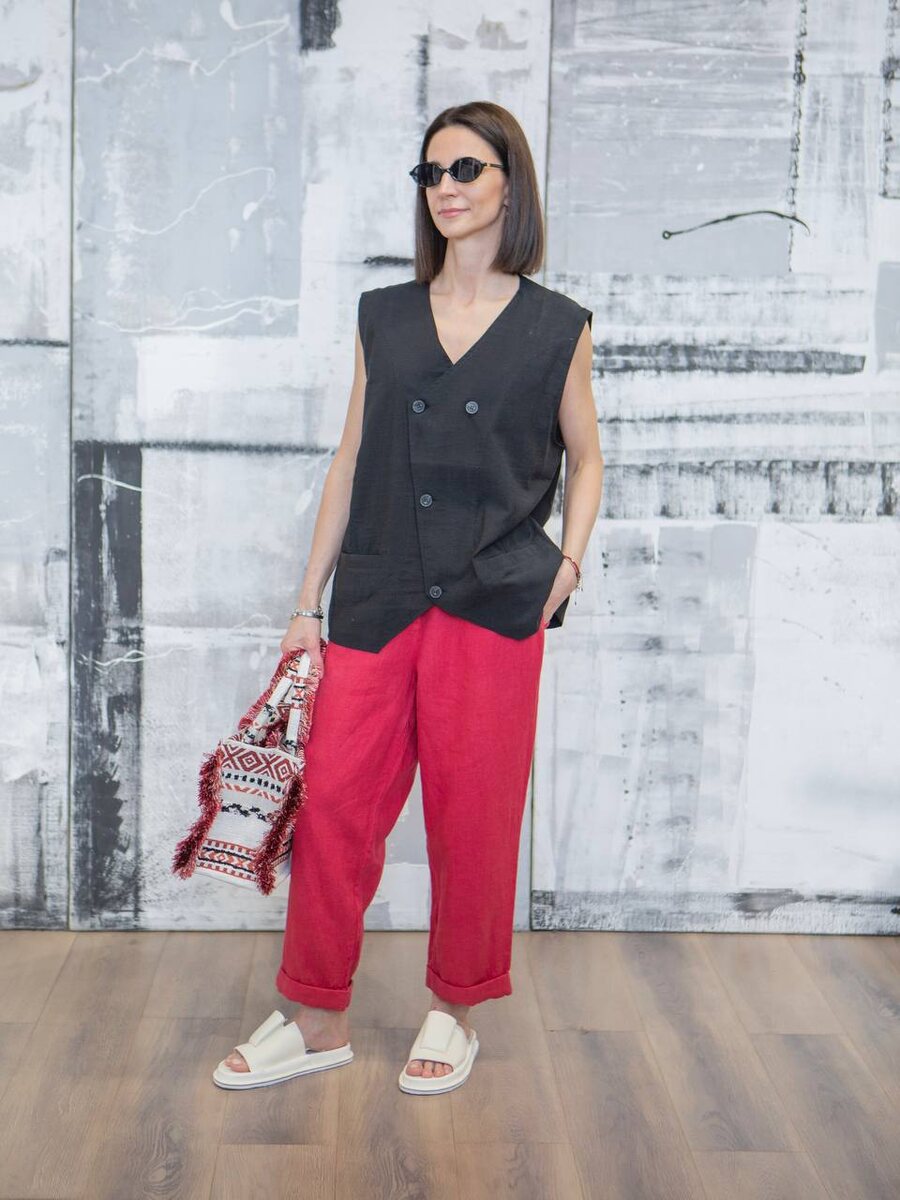 Широкие льняные брюки от GRIZAS в насыщенном красном оттенке. Легкий материал, комфортная посадка и декоративные подвороты делают модель универсальной для городской стилистики.