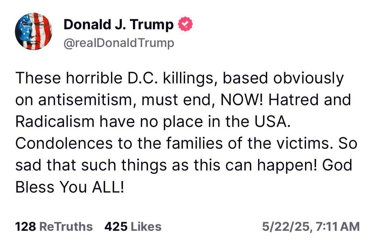 ⚡️Первая реакция Трамп на теракт в Еврейском музее в Вашингтоне: «Ужасные убийства на почве антисемитизма должны немедленно прекратиться