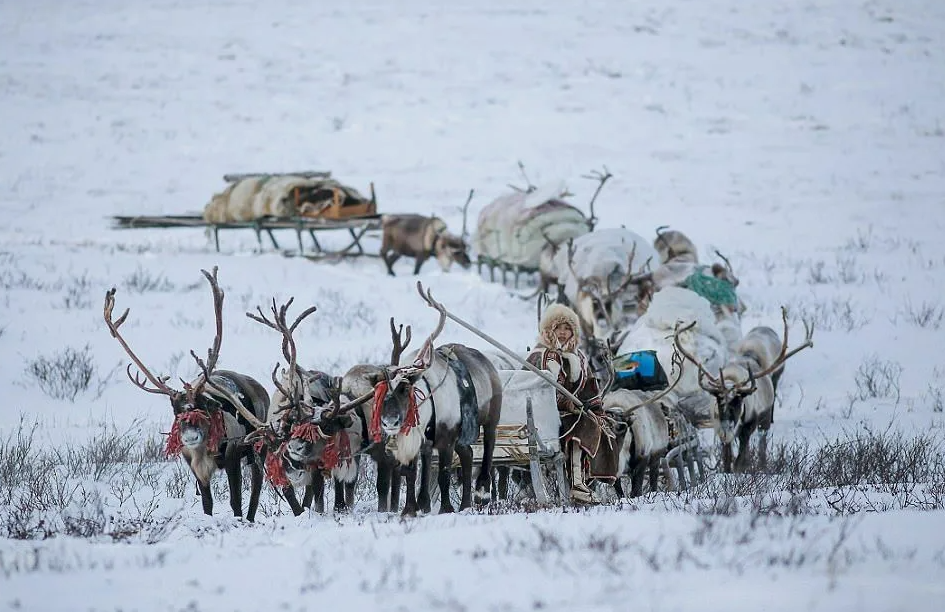 После длинной суровой зимы по многовековой традиции неспешно переходит длинный караван оленьих упряжек на летние стойбища. Это зрелище похоже на бесконечный поток из тысяч оленей.