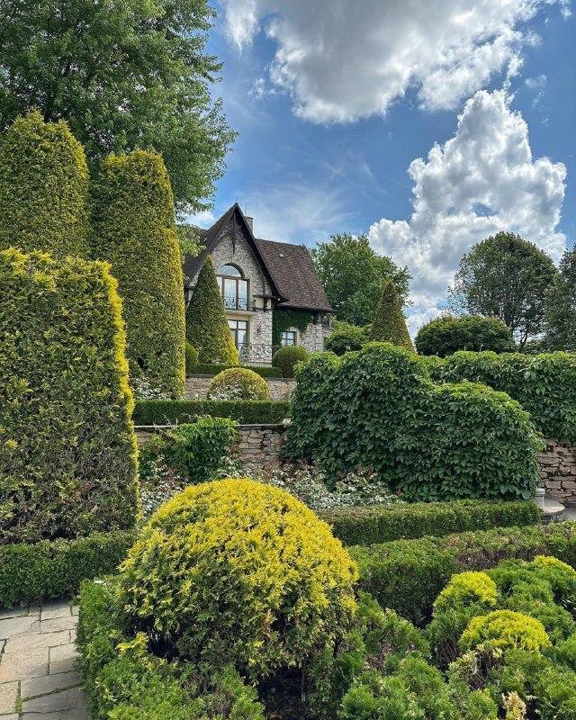 Центральная точка сада отмечена усадебным домом — маленьким замком в нормандском стиле. С одной стороны замок окружает итальянский сад, с другой — английский пейзажный парк.