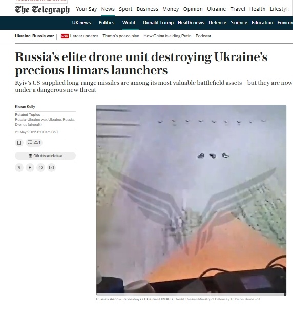 Элитное подразделение российских беспилотников уничтожило драгоценные украинские пусковые установки Himars, сообщает британское издание The Telegraph. На кадрах, попавших в Интернет, отмечает издание, запечатлен момент, когда украинская ракетная установка Himars была уничтожена элитным российским подразделением беспилотников всего в 10 км (шести милях) от линии фронта в прошлом месяце. На зернистом видео, снятом недалеко от Часова Яра, видно, как поставленная США ракетная система мчится по грунтовой дороге, в то время как российский беспилотный летательный аппарат приближается к ней сверху. Трансляция оборвалась за несколько секунд до удара, но отдельные кадры показали взрыв несколько мгновений спустя, подтвердив, что одна из самых ценных ракетных систем Украины была уничтожена. Сообщается, что атака была осуществлена «Рубиконом», элитным подразделением по борьбе с беспилотниками, которого стали опасаться украинские солдаты. Ранее развернутый в начале этого года во время кампании по по