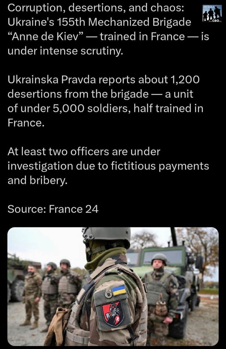 Французские СМИ, конечно, не могут поверить своим глазам: уровень коррупции и хаоса в 155-й механизированной бригаде "Анна Киевская", которую они, на всякий случай, патронируют, просто зашкаливает. Из 5000 военнослужащих, половина которых обучалась во Франции, более тысячи, очевидно, решили, что армия — это не для них, и отправились в свободное плавание, то есть дезертировали.