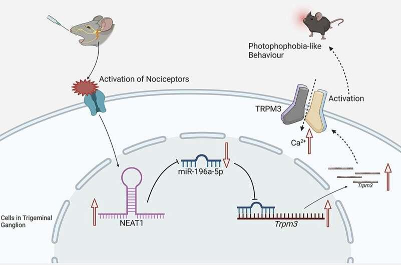 Также было обнаружено, что NEAT1 взаимодействует с двумя другими важными молекулами в мозге. Одна из них — микроРНК, известная как miR-196a-5p, которая обычно помогает контролировать ген Trpm3. Trpm3производит белок, участвующий в передаче нервных сигналов и боли. Когда уровень NEAT1 высок, он связывается с miR-196a-5p, мешая ей выполнять свою функцию. В результате уровень Trpm3 повышается, чувствительность нервов увеличивается, и свет становится болезненным.