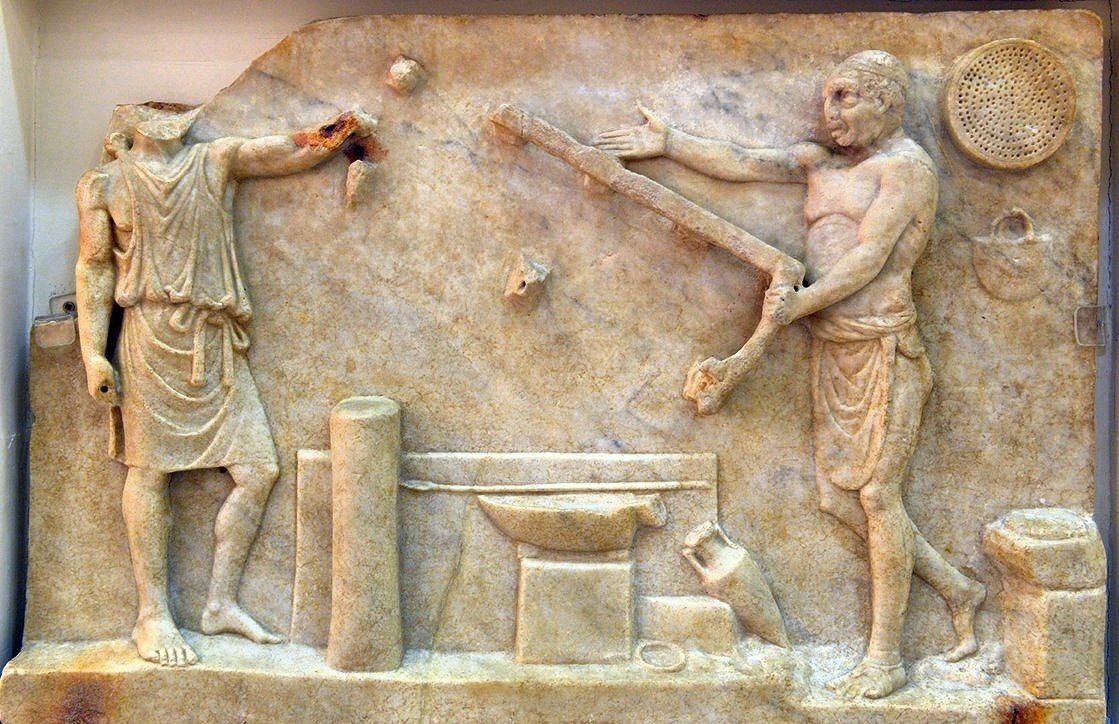 На рельефе I века, найденном в Остии, изображены двое рабочих в мастерской по мрамору. Один из них держит в руках пилу; перед ним лежит ёмкость, вероятно, с песком, и специальная длинная ложечка для подачи абразива.