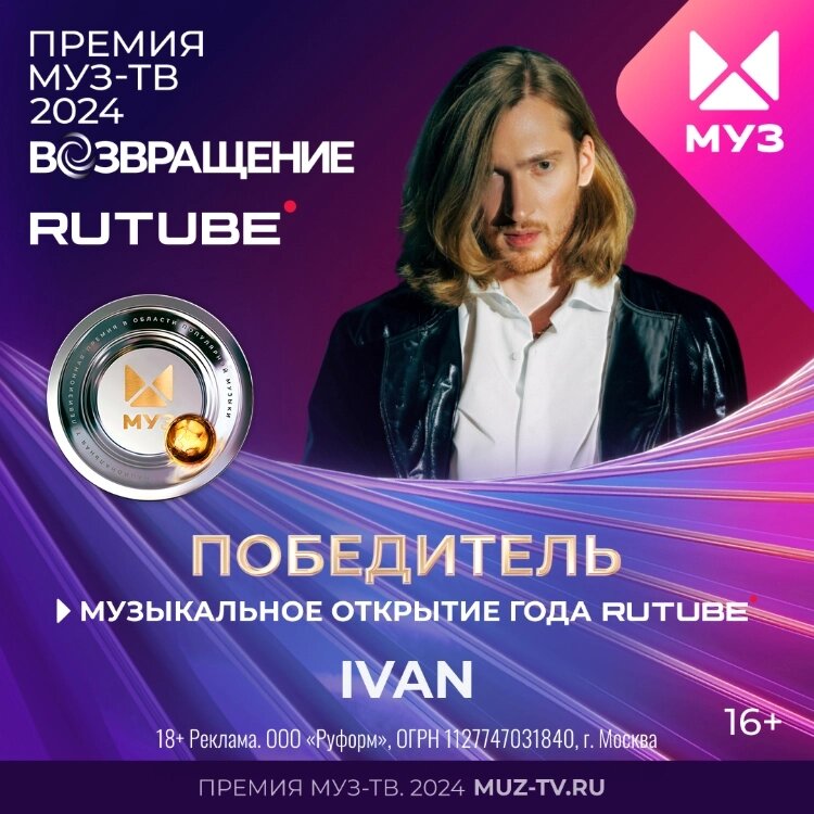 Анжелика Пушнова: Вот как раз тут у нас стоит белорусский красавец, не могу к нему не подойти. IVAN! Саш, расскажи про свои ощущения. В прошлом году ты не просто был на Премии, ты взял тарелку в номинации "Музыкальное открытие года RUTUBE".