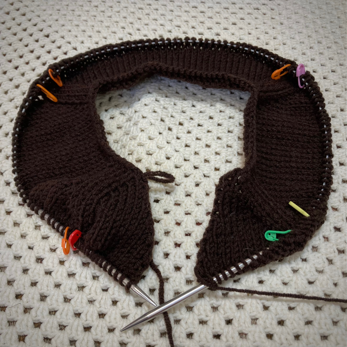 В ожидании белой пряжи на полосатый джемпер, начала шоколадный (цвет 26). Я ещё не умею вязать V-вырез с регланом сверху, отдельно вязала, буду учится! Из остатков пряжи на джемпере у меня не получится вырез ⬇️ По ходу вязания, посмотрим что получится 😉 Продуктивной вам недели ❤️