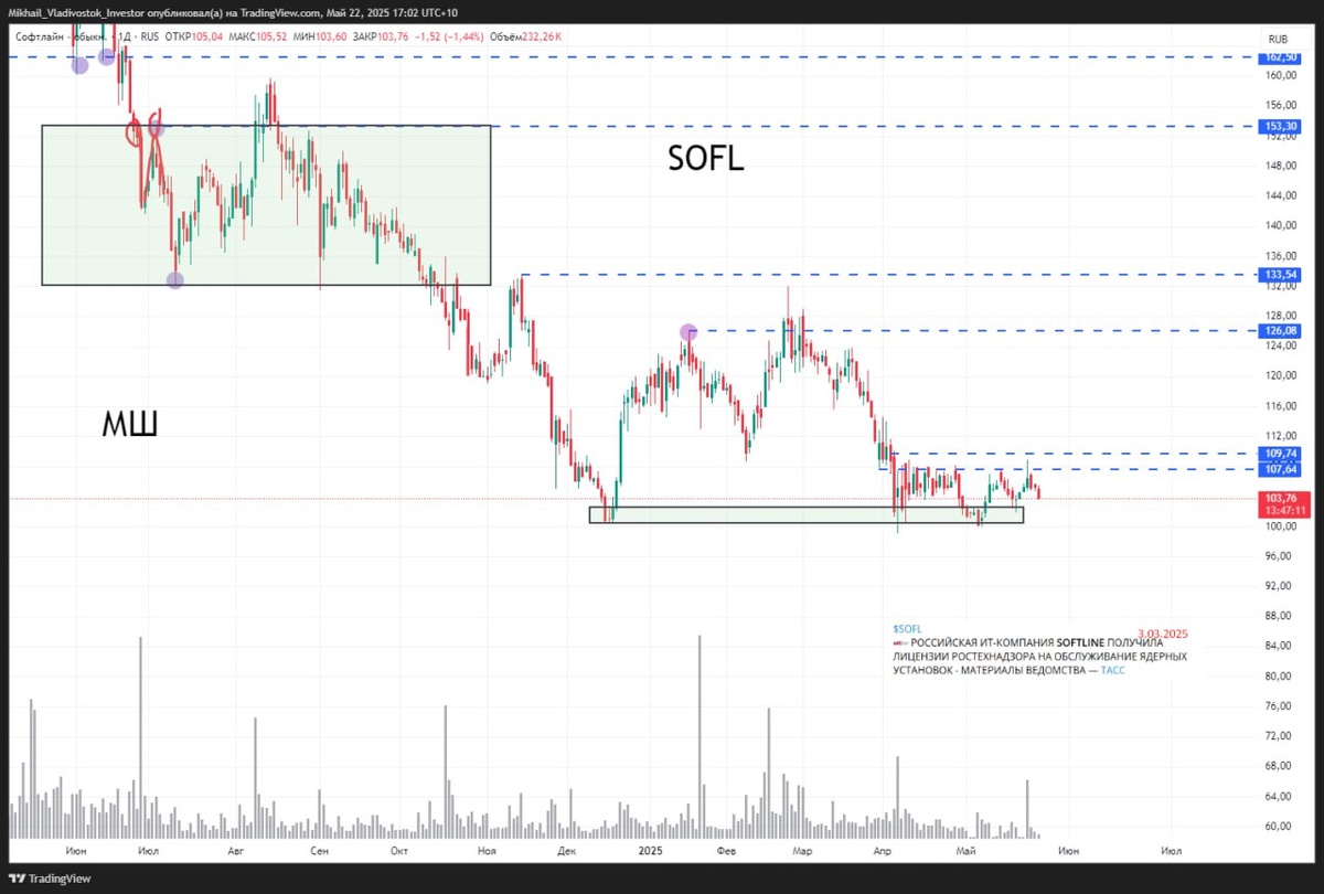 Расторговывается в боковике вблизи поддержки 100. Спроса нет абсолютно в моменте. Рассматривать можно только инвестиционные покупки.