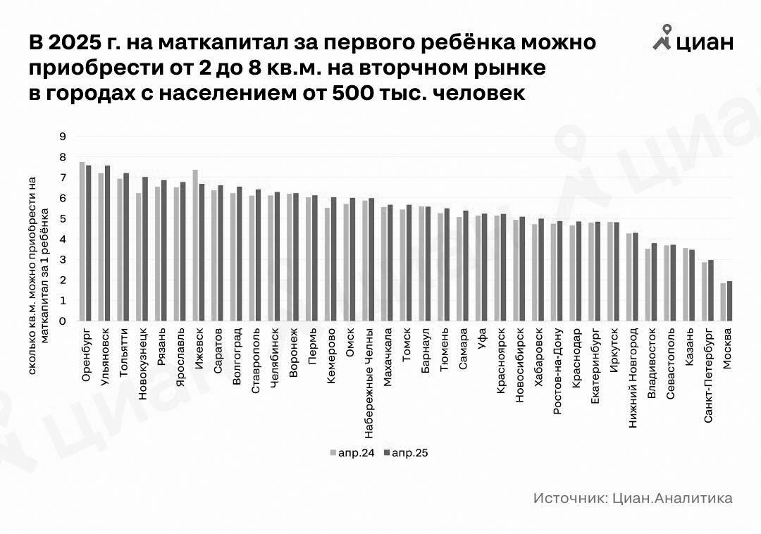 Материнского капитала за первого ребенка хватит на покупку в среднем 5,4 м² на вторичном рынке крупных российских городов, — ЦИАН.