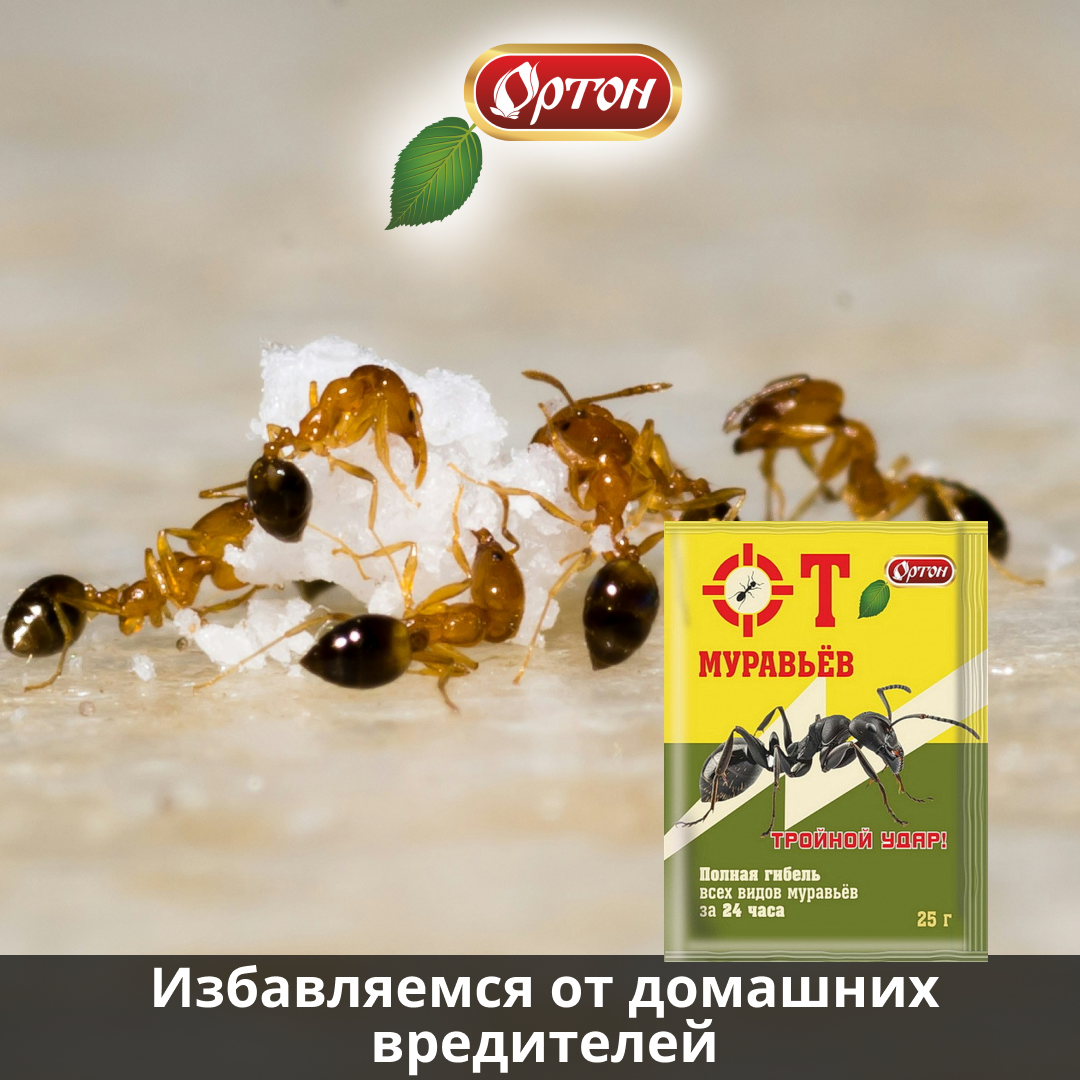 Муравьи являются переносчиками опасных патогенов — бактерий и микроорганизмов, которые могут причинить вред здоровью домочадцев. Эти насекомые портят продукты питания и загрязняют поверхности, они могут проникать в квартиру или дом и создавать колонии в укромных уголках, вызывая дискомфорт жильцов. Вывести муравьев бывает очень сложно. Если их относительно немного, можно попробовать натуральные средства — смеси на основе эфирных масел, уксуса и воды, которые распыляют в местах появления насекомых. Чтобы достичь гарантированного результата в борьбе с муравьями, используйте препарат «От муравьев» от компании «Ортон». Правильно подобранная комбинация веществ с различными механизмами действия позволяет получить максимальный эффект. Действие компонентов препарата не оставляет шансов на выживание даже тем насекомым, которые развили устойчивость к другим средствам: ✅ Альфа-циперметрин нарушает работу нервной системы насекомых, приводя к параличу и смерти. ✅ Ацетамиприд нарушает передачу нервн