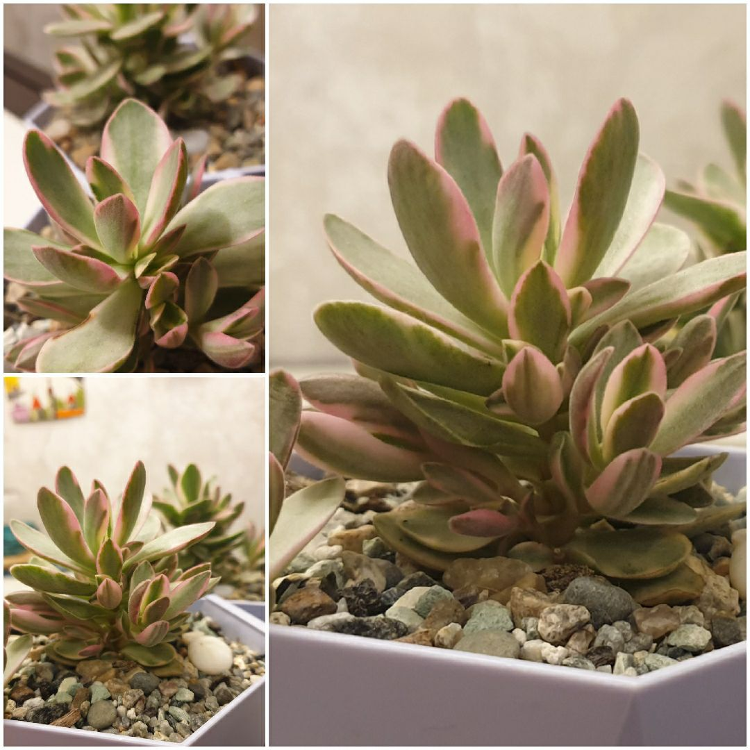 При ярком освещении листья розовеют Крассула вариегатная «Мани Мейкер» относится к семейству Толстянковые (Crassulaceae). Это суккулентное растение — одна из форм всем известного "денежного дерева" (Crassula ovata), полученная путём селекции. Особенность вариегатной формы — в пестрых, кремово-зелёных или желто-зелёных листьях с розоватыми краями. Такие растения особенно ценятся за декоративность и редкость. 2. История одомашнивания Обычная крассула культивируется людьми уже несколько столетий, в основном как комнатное растение, символизирующее достаток. Вариегатные формы, включая «Мани Мейкер», появились сравнительно недавно — это результат селекционной работы, направленной на получение декоративных, но неприхотливых форм. Сегодня вариегатные крассулы выращивают как коллекционеры, так и просто любители необычных растений. 3. Особенности растения «Мани Мейкер» — компактное растение с толстыми, мясистыми листьями овальной формы. Главное отличие — вариегатность: на листьях чередуются крем